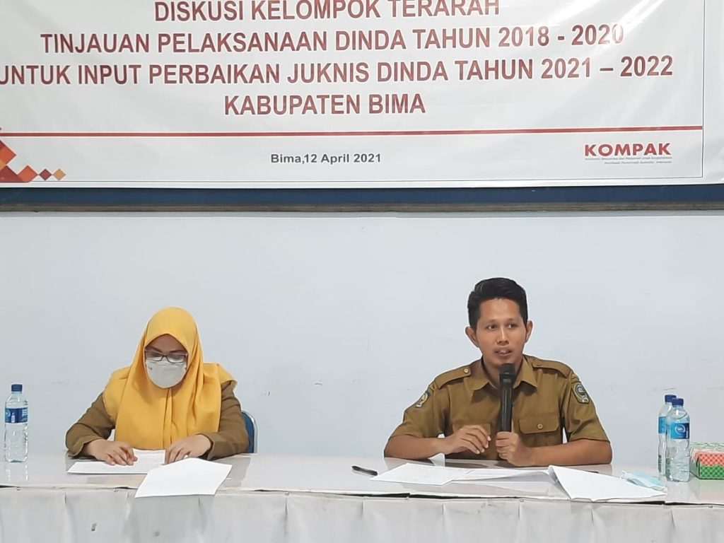 Bima, Jeratntb.com – Pelaksanaan Diskusi Kelompok Terarah/Focus Discussion Group (FGD) Tinjauan Pelaksanaan Dana Insentif Desa (DINDA) untuk Input Perbaikan Petunjuk Teknis (Juknis) DINDA tahun 2021-2022, kerjasama Program Kolaborasi Masyarakat dan Pelayanan untuk Kesejahteraan (KOMPAK) dengan Pemerintah Kabupaten Bima yang berlangsung Senin (12/4) secara daring dan tatapmuka di aula SMIK Kota Bima.