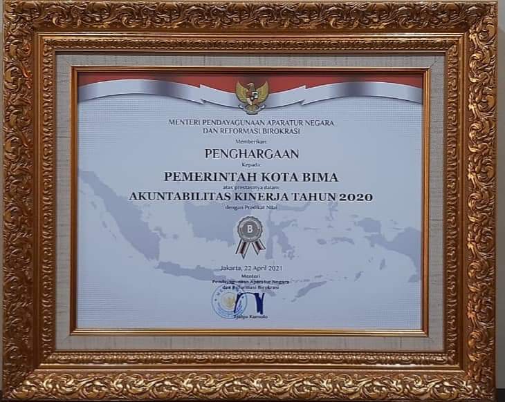 Kota Bima, Jeratntb.com – Pemerintah Kota Bima kembali meraih predikat B terhadap evaluasi SAKIP. Hasil evaluasi pelaksanaan reformasi birokrasi (RB) dan akuntabilitas kinerja instansi pemerintah provinsi/kabupaten/kota tahun 2020 tersebut diserahkan secara simbolis oleh Menteri PANRB Tjahjo Kumolo pada Kamis, 22 April 2021 pukul 09.00 WIB di Jakarta. Tak hanya menyerahkan hasil evaluasi diserahkan pula rekomendasi perbaikannya. Evaluasi tersebut diterima oleh Sekretaris Daerah Kota Bima Drs.H.Mukhtar, MH,.