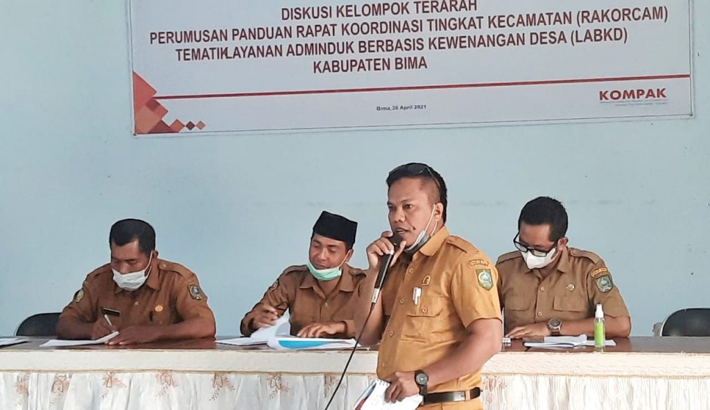 Bima, Jeratntb.com – Pemerintah Kabupaten Bima atas dukungan Program Kolaborasi Masyarakat dan Pelayanan untuk Kesejahteraan (KOMPAK) terus berupaya meningkatkan peran Camat dan Kepala Desa dalam Tata kelola Administrasi Kependudukan. Upaya tersebut diwujudkan dalam Diskusi Kelompok Terarah (FGD) Perumusan Panduan Rapat Koordinasi Tingkat Kecamatan (Rakorcam) Tematik Layanan Administrasi Kependudukan (Adminduk) Berbasis Kewenangan Desa (LABKD) yang berlangsung Senin (26/4) secara daring dan tatapmuka di Gedung PKK Kabupaten Bima.