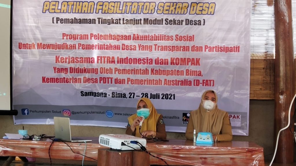 Bima, Jeratntb.com – Pelatihan Fasilitator Sekolah Anggaran Desa (Sekar Desa) bagi Pemahaman Tingkat Lanjut Modul Sekolah Anggaran (Sekar Desa) Program Pelembagaan Akuntabilitas Sosial untuk Mewujudkan Pemerintahan Desa yang Transparan dan Partisipatif, berlangsung selama dua hari (27-28) Juli 2021 dibuka secara resmi Senin (27/7) di Kafe Sampana Kota Bima.
