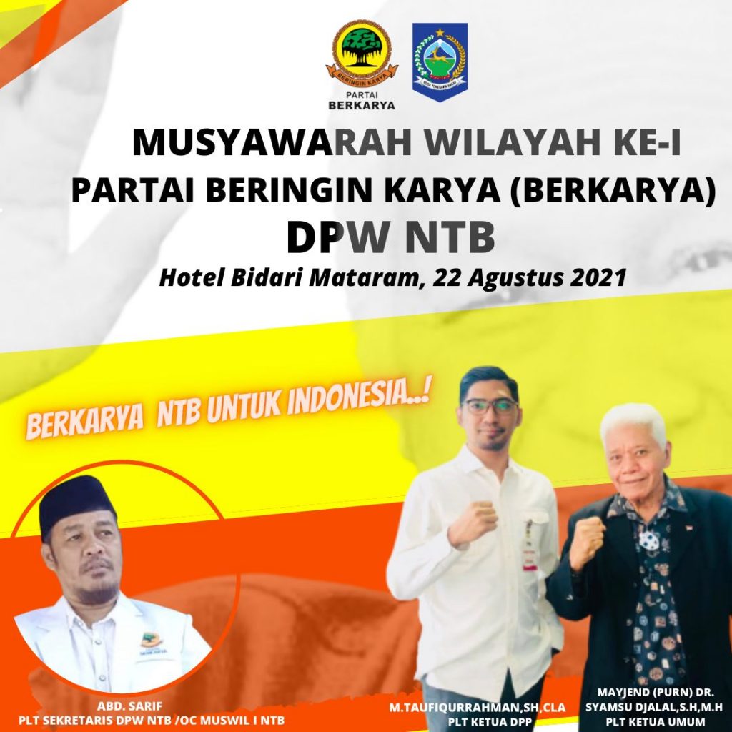 Salah satu tugas yang dibebankan kepada PLT Ketua Umum DPP Partai Beringin Karya (Berkarya) adalah merapikan insfrasturktur kepengurusan disemua tingkatan untuk mempersiapkan diri menghadapi tahapan pemilu 2024. Salah satu infratsruktur yang perlu dirapikan adalah DPW Provinsi NTB, oleh karena itu pada tanggal 22 Agustus 2021 bertempat di Hotel Bidari Kota Mataram NTB, dengan visi “Revitalisasi Partai Berkarya DPW NTB menuju sukses Pemilu 2024, maka DPW NTB akan melaksanakan Musyawarah Wilayah I untuk mencari Figur yang akan menahkodai Partai Beringin Karya (Berkarya) DPW NTB untuk masa bakti 2020-2025.