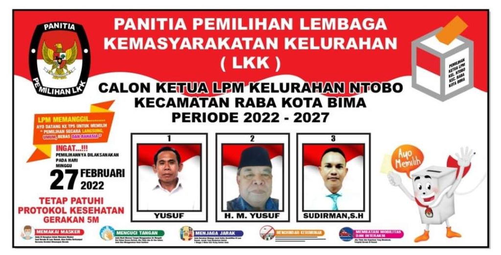 Kota Bima, Jeratntb.com – Tiga orang tokoh yang sama-sama mencalonkan diri sebagai ketua Lembaga Pemberdayaan Masyarakat (LPM) kelurahan Ntobo kecamatan Raba akan dipilih secara demokrasi oleh masyarakat kelurahan Ntobo pada hari ini Minggu (27/2). Ketiga calon tersebut yakni Yusuf, H.M Yusuf dan Sudirman.