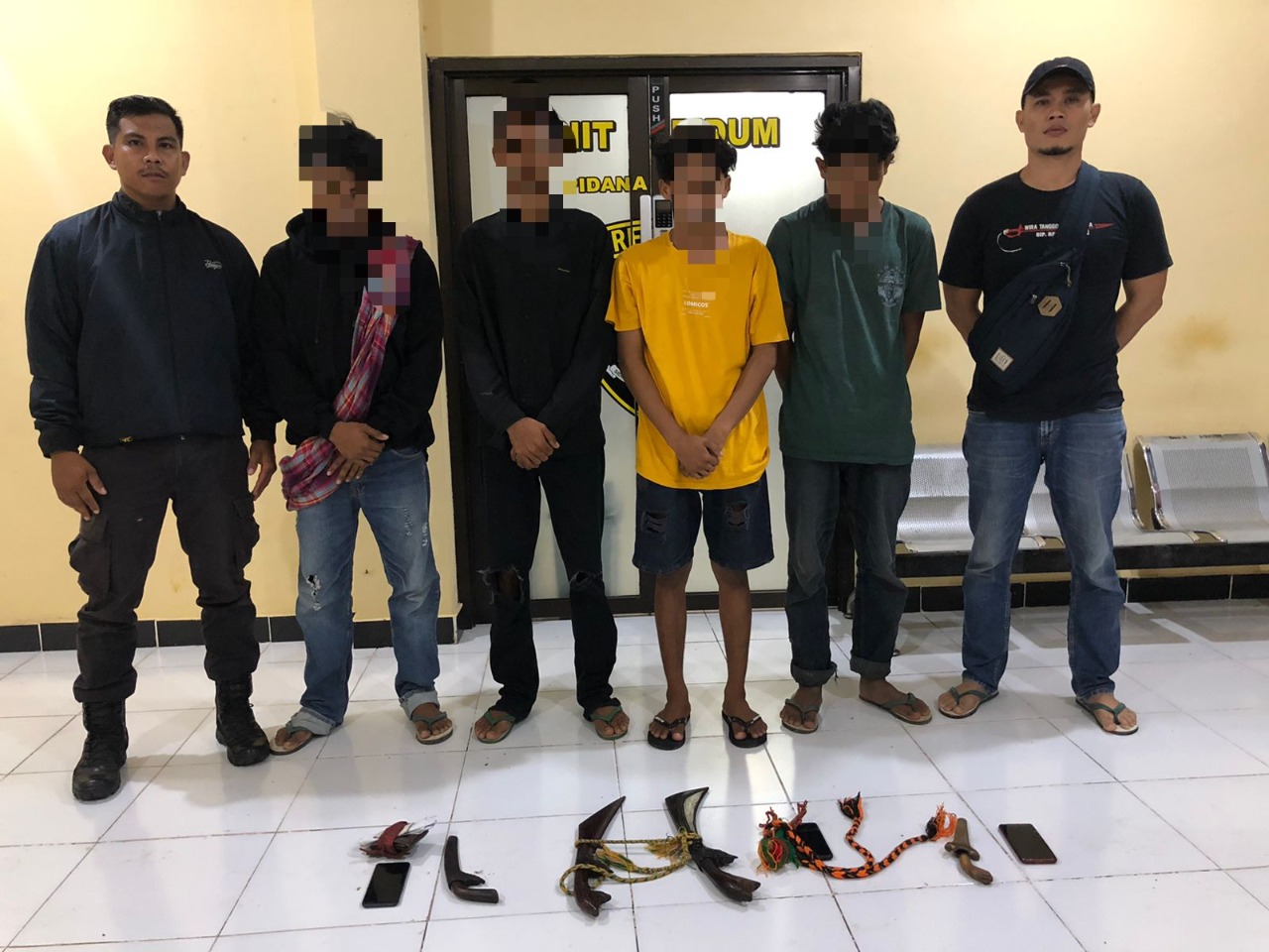 Selain mengamankan barang bukti berupa 2 bilah parang, 2 bilah golokdan 1 Ketapel Panah kata Kompol Muslih, juga diamankan para pemuda selaku pemilik saham tersebut.