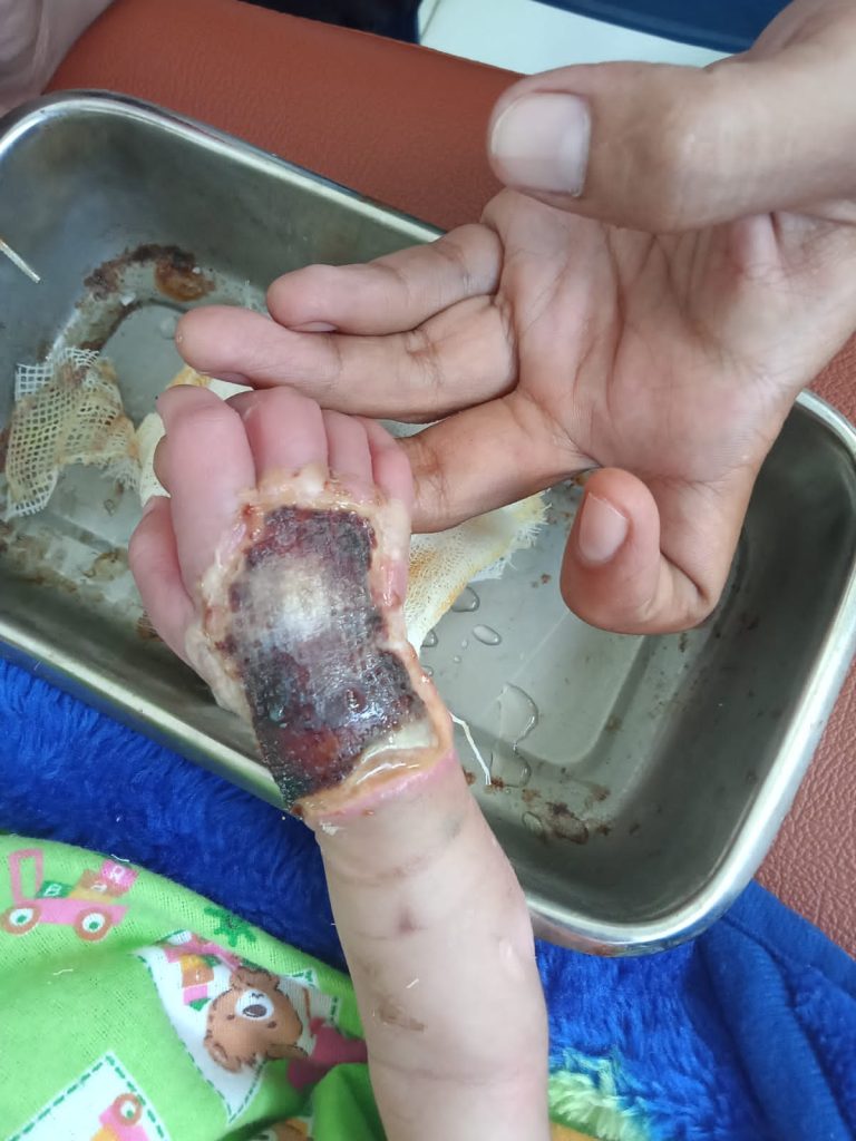 Kondisi itu diketahu ketika ibu pasien mengantar anaknya ke Puskesmas Palibelo saat perban di tangan bayi dibuka.