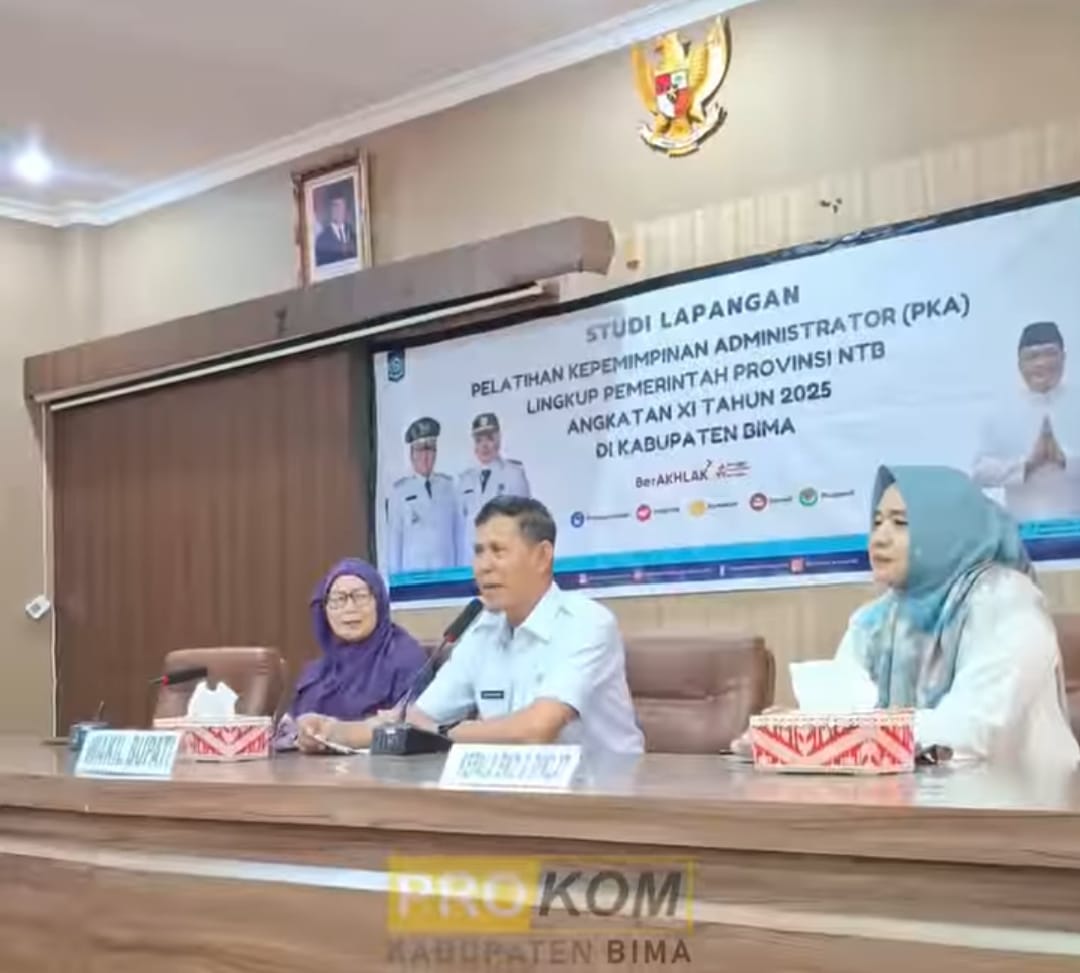 Bima, Jeratntb.com – Sebanyak 40 peserta yang hadir dengan 7 pejabat pendamping, Diklat Kepemimpinan Administrator (PKA) BPSDM Pemerintah Provinsi NTB Angkatan XI Tahun 2025 yang melakukan Studi Lapangan di Kabupaten Bima, Rabu (5/3) diterima secara resmi oleh Wakil Bupati Bima dr. H. Irfan Zubaidy di Ruang Rapat utama kantor Bupati Bima.