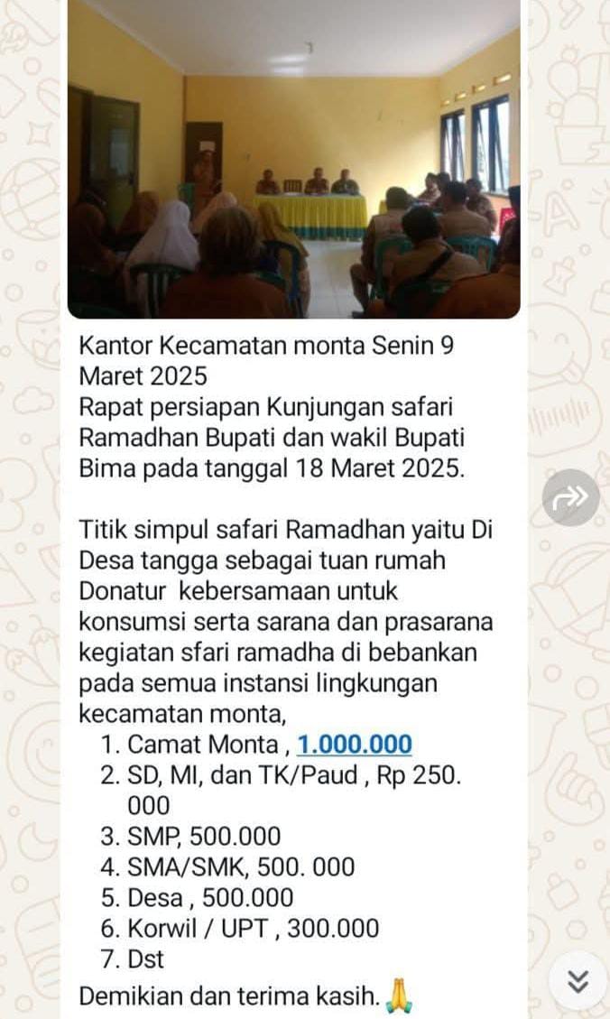 Pada pertemuan tersebut, sejumlah kepala sekolah diminta untuk menyetor sejumlah uang untuk menyukseskan kegiatan safari ramadan Kecamatan Monta yang sedianya akan berlangsung pada 18 Maret 2025 mendatang. Diduga, para kepala sekolah diminta menyetor uang yang bervariasi. Mulai SD/TK/PAUD dipatok sebesar Rp 250 ribu per sekolah. Sementara untuk SMP, SMA /SMK dan Desa sebesar Rp 500 ribu. Tidak hanya itu, Korwil juga dipatok untuk menyetor Rp 300 ribu dan terakhir Camat sebesar Rp 1 juta.