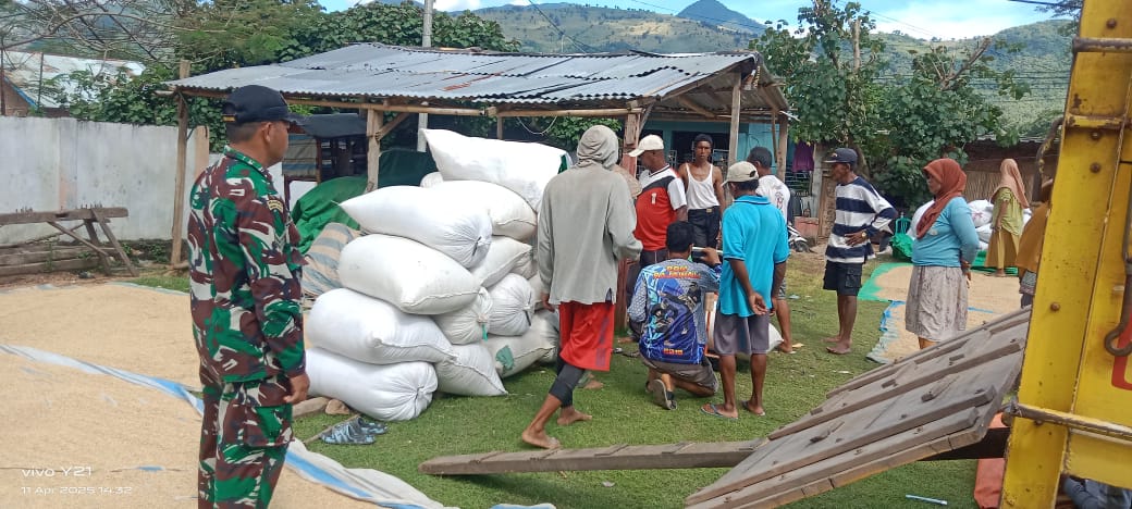 Bima, Jeratntb com – Babinsa Desa Teke Sertu Bunyamin Koramil 1608-04/Woha Kodim 1608 Bima hadirkan mobil Bulog untuk membeli hasil Gabah para petani padi desa Teke kecamatan Palibelo sore tadi (11/4/2025)