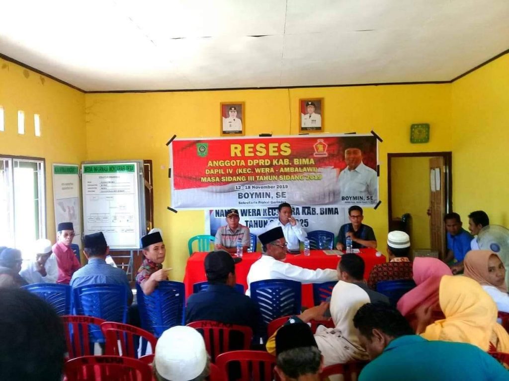 Bima, Jeratntb.com- Berdasarkan Surat Ketua Dewan perwakilan Rakyat Daerah (DPRD) Kabupaten Bima Nomor:172.1/459/DPRD/2019 Tertanggal , 08 November 2019, Pirahal Jadwal Reses Dapil IV Wera Ambalawi Mulai Tanggal 12 sd 18 November. Hari ini Desa Nanga Wera dipilih menjadi tempat pertama reses Boymin, SE.