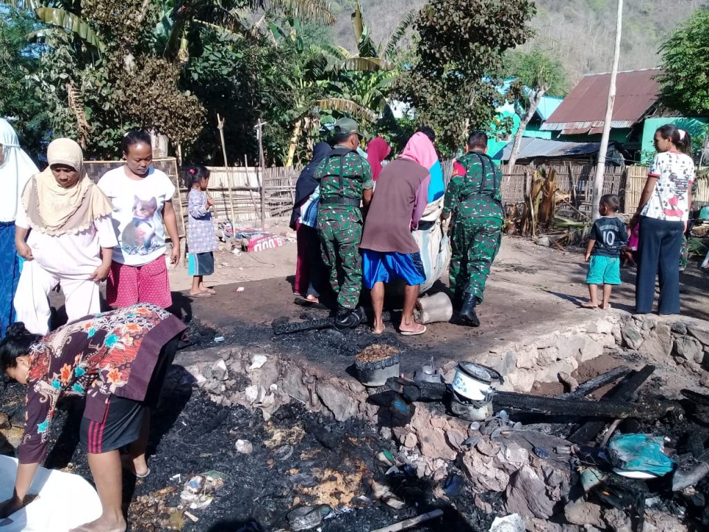 Bima, Jeratntb.com β Anggota Koramil 1608-04/Woha dipimpin Danposramil Belo Pelda Hamdon melaksanakan karya bakti membantu warga korban kebakaran di RT. 19 RW. 10 Desa Teke Kecamatan Palibelo Kabupaten Bima, Selasa (26/11).