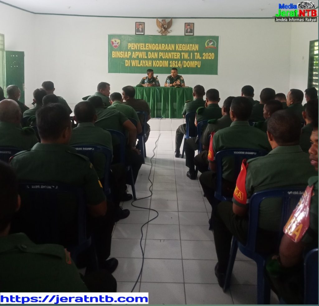 Dompu, Jeratntb.com – Dalam rangka meningkatkan kesiapan dan kemampuan parajurit dalam pelaksanaan tugas dan pemberdayaan wilayah pertahanan jajaran Kodim Wilayah Korem 162/Wira Bhakti melaksanakan kegiatan Pembinaan Kesiapan Aparat Kewilayahan Dan Kemampuan Teritorial Binsiap Apwil dan Puanter TW TA. 2020 Kamis (5/2-20).