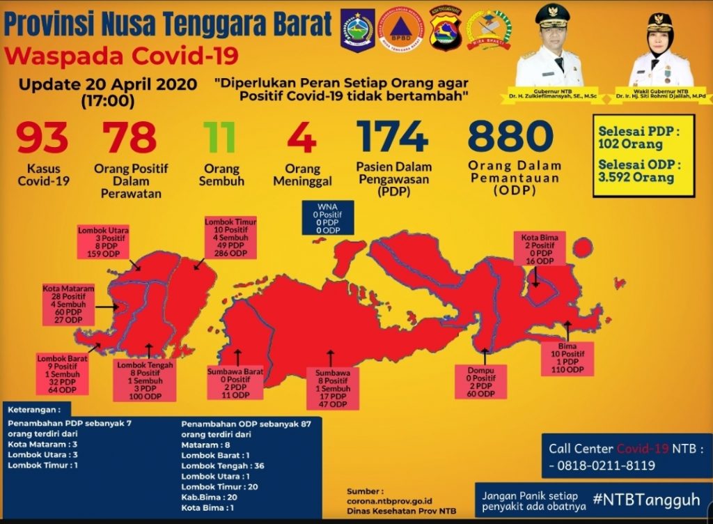 “Dengan adanya tambahan 21 kasus baru terkonfirmasi Positif Covid-19, tidak ada sembuh baru, dan tidak ada kematian baru, maka jumlah pasien positif Covid-19 di Provinsi NTB sampai hari ini (20/4/2020) sebanyak 93 orang, dengan perincian 11 orang sudah sembuh, 4 (empat) meninggal