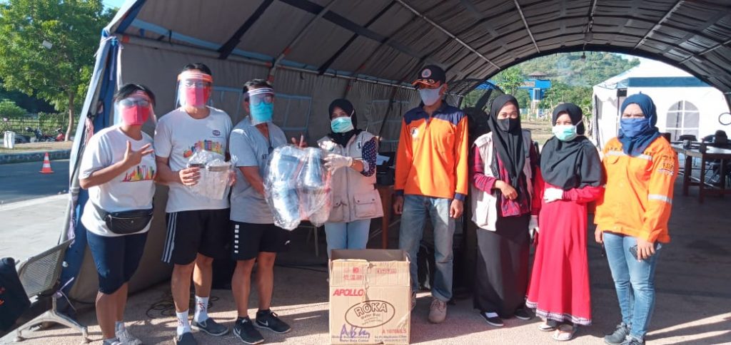 Kota Bima, Jeratntb.com – Komunitas Jalan Sehat Pagi (KJSP) Kota Bima berikan bantuan Alat Pelindung Diri (APD) berupa Face Shield pada tim gugus pengawasan dan penanganan wabah Covid-19 yang bertugas di perbatasan kota Bima pagi ini, Senin (04/5/20).
