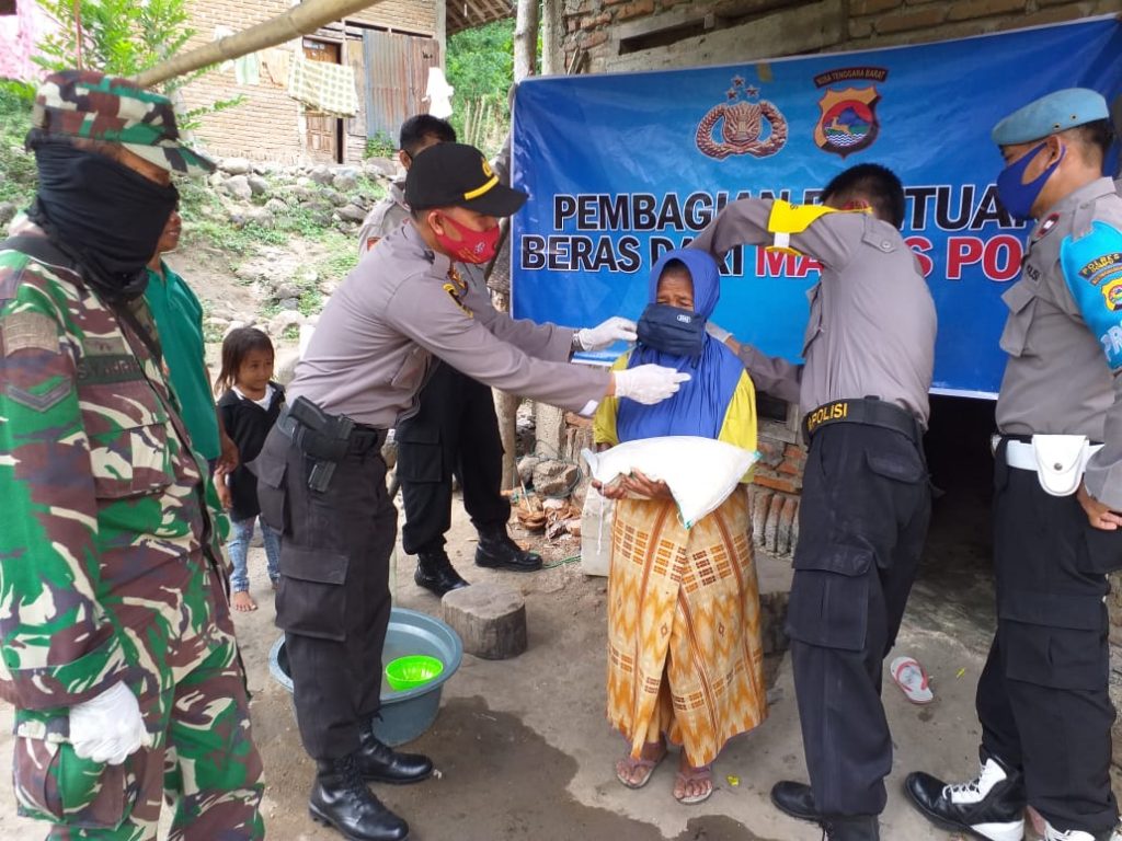 Giat Polri yang dilaksanakan dengan membagikan beras yang merupakan bantuan langsung dari Mabes Polri kepada warga miskin dan yang terdampak Covid-19 di Desa dan Kelurahan yang ada di wilayah Kecamatan Dompu, Kabupaten Dompu, pada hari kamis (28/5-20).