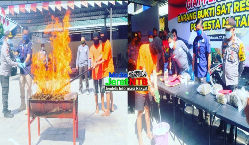 Mataram,Jeratntb.com- Satresnarkoba Polresta Mataram memusnahkan barang bukti narkotika jenis sabu seberat 3.064,99 gram dan ganja seberat 6.416 gram, dimusnahkan di lapangan Mapolres Mataram, Jum’at (17/07-20)