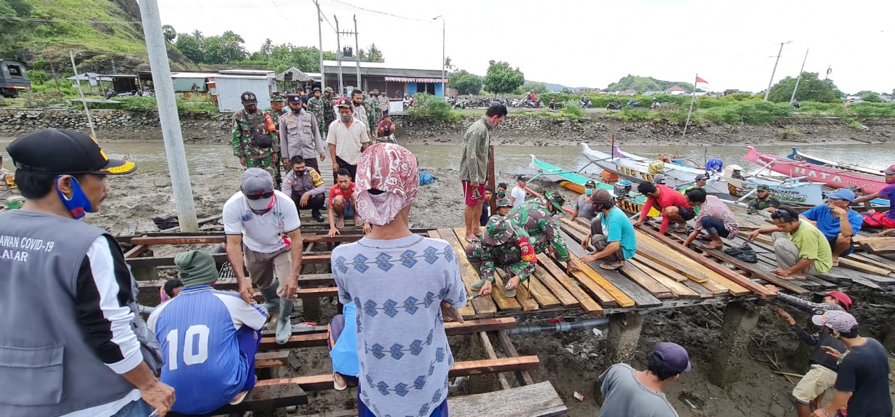 Sumbawa Barat, Jeratntb.com – Antusiasme dan kebersamaan anggota Kodim 1628/SB, anggota Koramil taliwang, anggota polsek taliwang , anggota Kompi Brimob, segenap komponen masyarakat gotong royong memperbaiki jalan rumah apung dusun Wara B labuhan lalar, di pimpin Pasi ter Kodim 1628/SB Kapten Cba Agus.