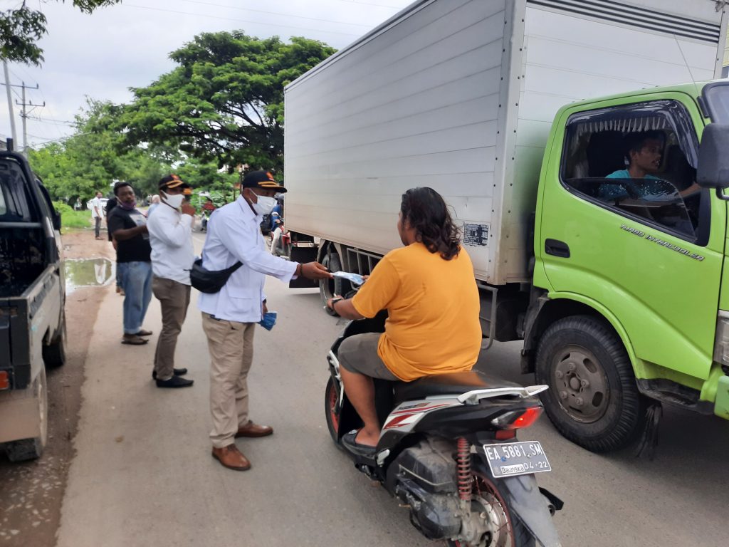 Dipimpin langsung ketua DPC Drs H Dahlan M Noer, aksi sosial pembagian masker ini dilakukan di depan kantor DPC di desa Rabakodo kecamatan Woha.